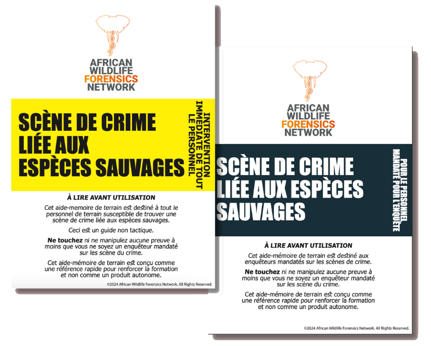 Ces « Aide-mémoires » sont faits pour être des guides de référence de poche pour les agents de terrain qui ont suivi une formation appropriée basée sur le Guide des scènes de crime liées aux espèces sauvages pour les premiers intervenants.